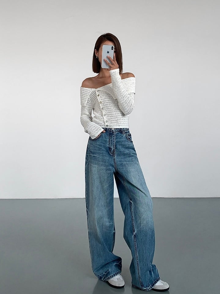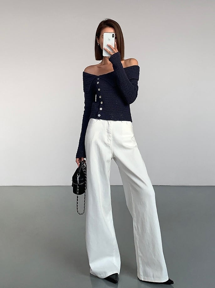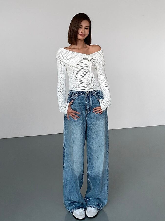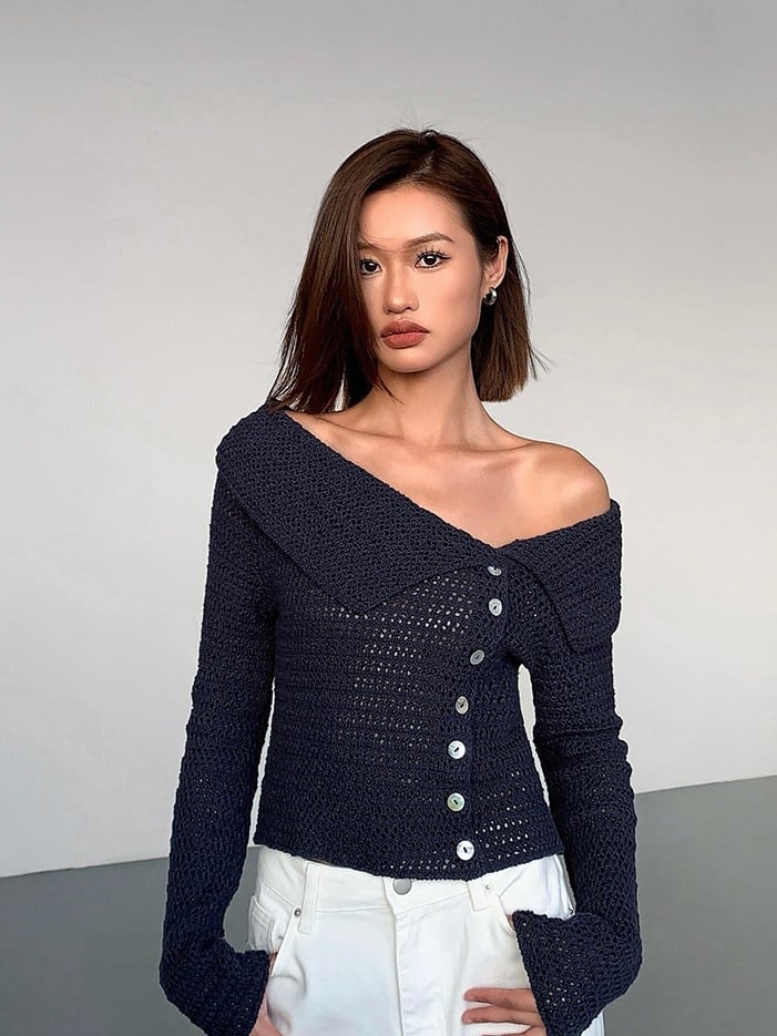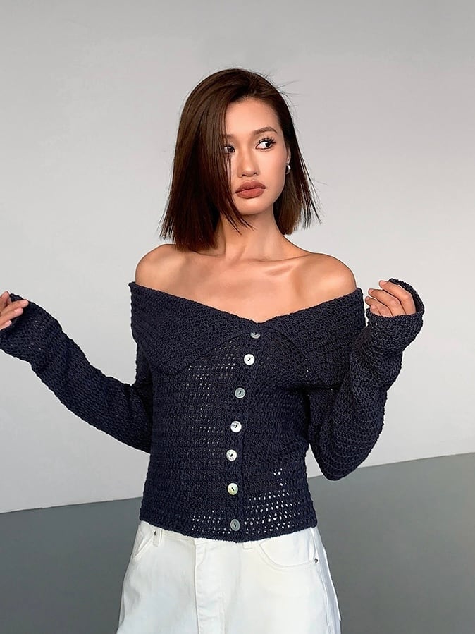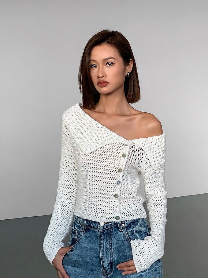 普通のニットとは一線を画す、個性的で視線を集めるデザインです。肩をさりげなく見せることで、女性らしい抜け感を演出します。フロントのボタンがアクセントになっており、デザイン性を高めています。閉じても開けても、着こなしに変化をつけることができます。体に優しくフィットしつつも、動きやすさを確保し、長時間着ていても疲れにくいのが特徴です。春夏はもちろん、秋冬はインナーやアウターとレイヤードしても可愛く、一年中使える万能アイテムです。