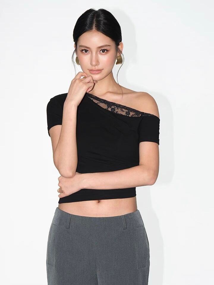 大胆なワンショルダーデザインが、デコルテと肩のラインをすっきり魅せてヘルシーな色気をプラスします。視線を引きつける洗練されたデザインが特徴です。デコルテに沿って施された繊細なレースが女性らしさを引き立てるアクセントに。ボディにフィットするデザインで、ウエスト周りがスッキリ見えます。短すぎず長すぎない丈感で、ハイウエストボトムとも相性抜群です。