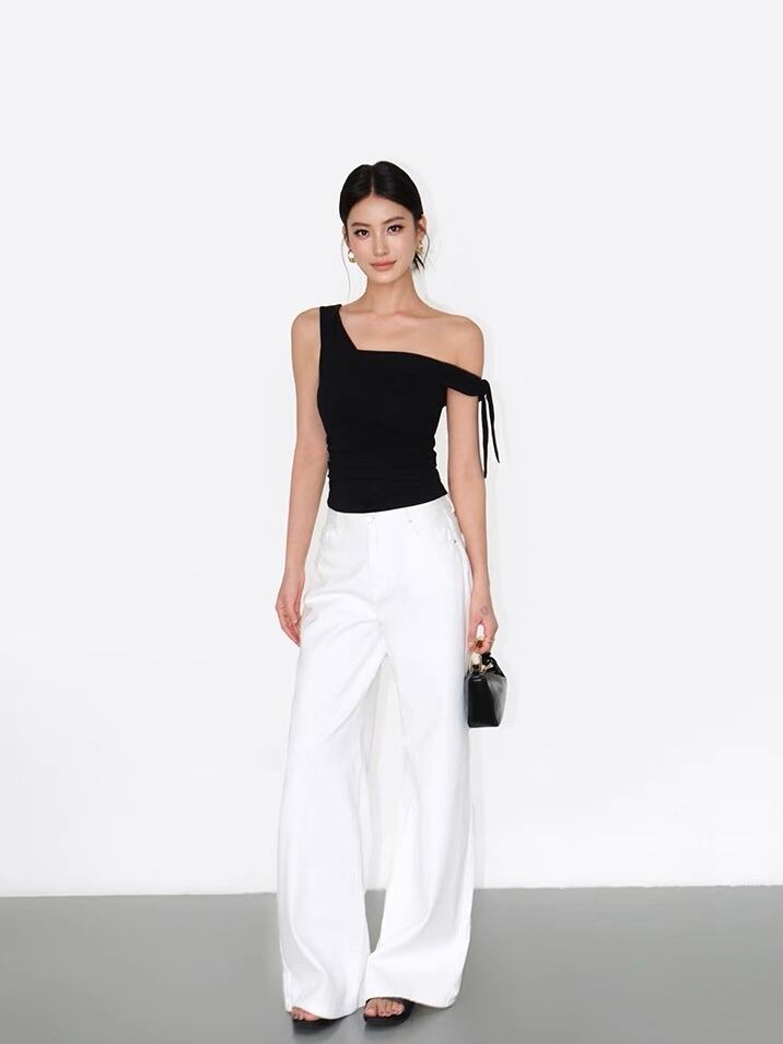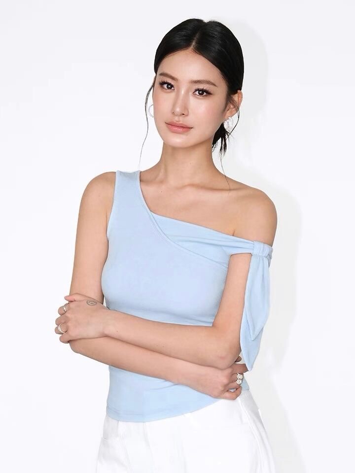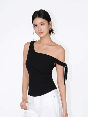 肩にリボンを結ぶデザインが可愛さを引き立てます。動く度に揺れてフェミニンさをさりげなくアピール。一味違ったワンショルダーのラインで、肩のラインや鎖骨を綺麗に見せてくれます。スタイリングに自然な抜け感を出せるのも魅力です。ストレッチの効いた素材がほどよくフィットして、着るだけで女性らしいシルエットを演出します。ウエストがすっきりと見えるのでスタイルアップ効果も抜群です。