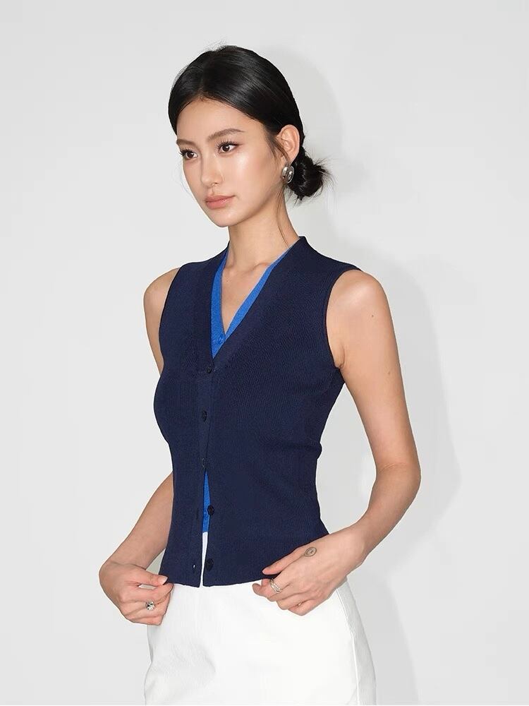 フィット感のある素材に、ボタンディテールで程よいきちんと感をプラスしたノースリーブトップスです。深めのVネックで首元がすっきり見え、レイヤード次第で季節問わず着まわせる万能アイテムです。上品なカラーリングが大人の雰囲気を演出し、1枚でも羽織のインナーとしても映える優秀デザインです。