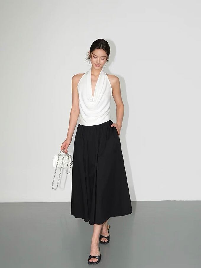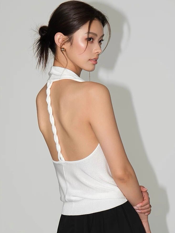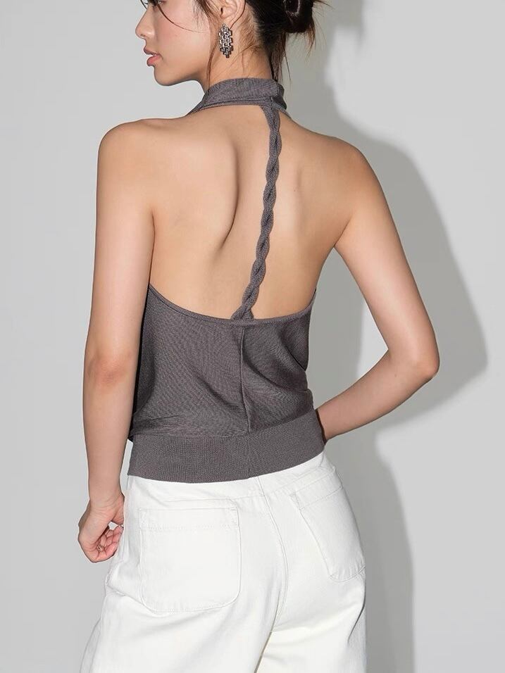 バックスタイルに編み込み風のツイストデザインを施したホルターネックが、思わず振り返りたくなる美しさを演出します。フロントは胸元に自然なドレープを効かせており、上品な抜け感と立体感が魅力的です。柔らかくフィットする素材で着心地も抜群です。パンツにもスカートにも相性が良く、デートやお出かけシーンにもぴったりな一枚です。