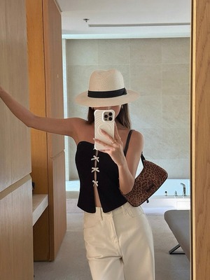 フロントに並んだ小さなリボンが特徴的で、シンプルなシルエットの中にフェミニンなアクセントを加えているチューブトップです。柔らかい素材が体に程よくフィットし、ウエストを美しく引き締めて見せる効果があります。胸元から裾にかけての縦ラインが強調されるため、スタイルアップも期待できるデザインです。肩を出すチューブタイプで、ヘルシーかつ女性らしい雰囲気を演出します。デニムと合わせればカジュアルに、スカートやワイドパンツと合わせればモードで洗練されたコーディネートに仕上がります。リゾートや夏のお出かけにもぴったりな一枚で、シンプルながらも存在感のあるアイテムです。