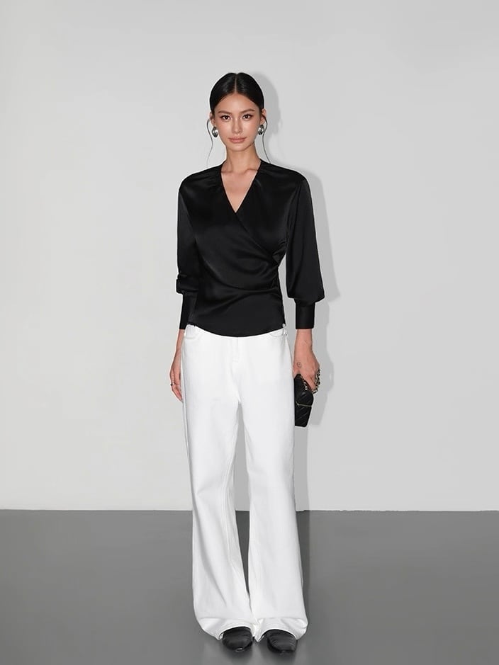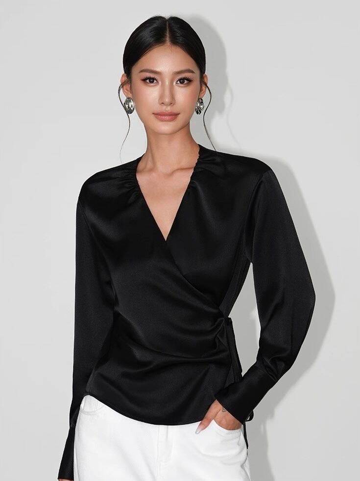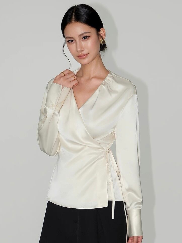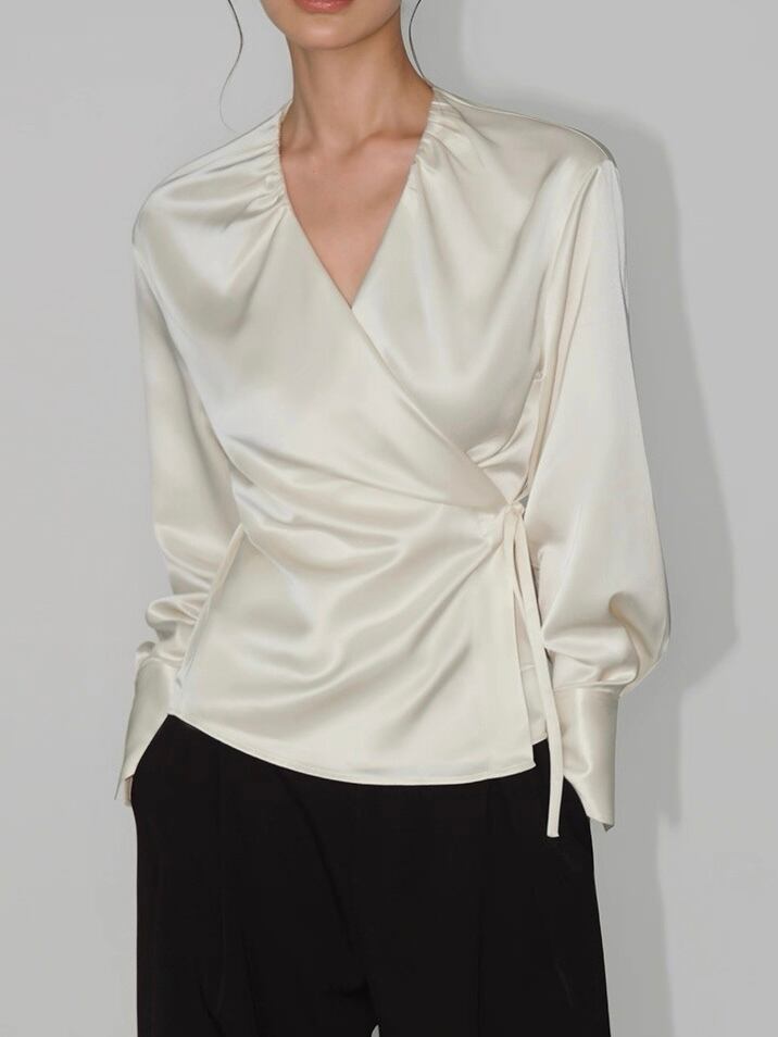深めのVラインがデコルテを美しく見せ、フェミニンで上品な雰囲気を演出します。オンでもオフでも取り入れやすい万能デザインです。動く度に柔らかく光を反射する素材が、ラグジュアリーなムードをプラス。シンプルなボトムスと合わせるだけで洗練された印象に。ウエストのリボンで調整できる仕様なので、体型に合わせてフィット感を変えられ、スタイルアップ効果も抜群です。