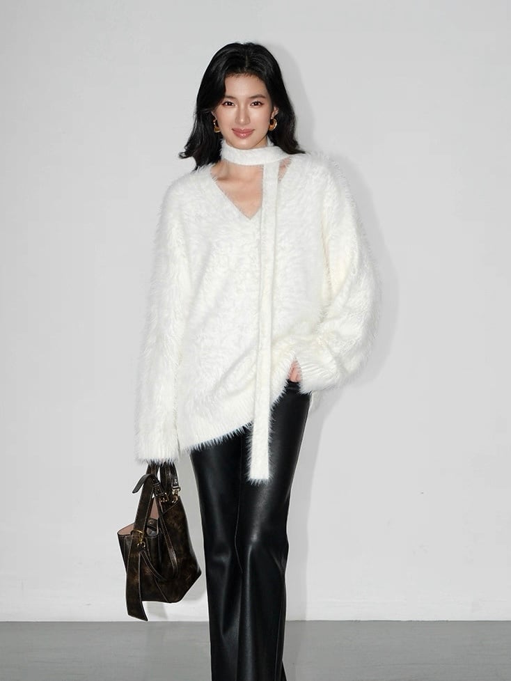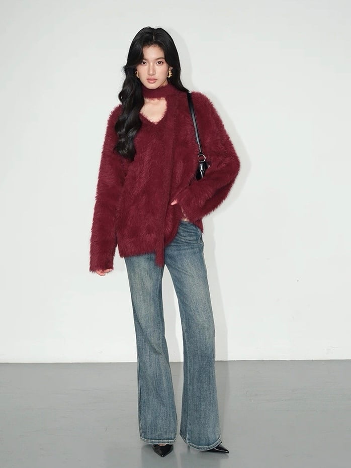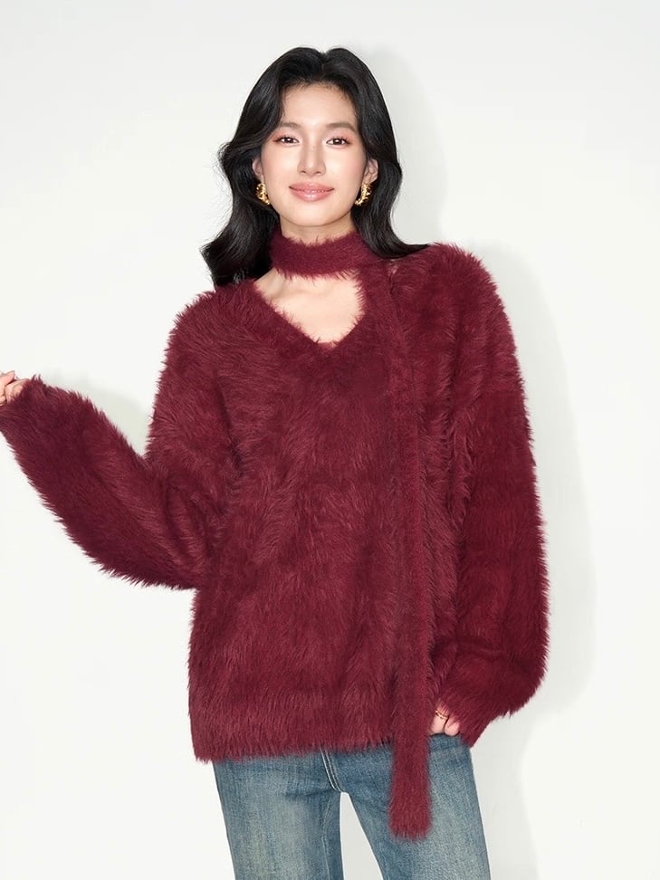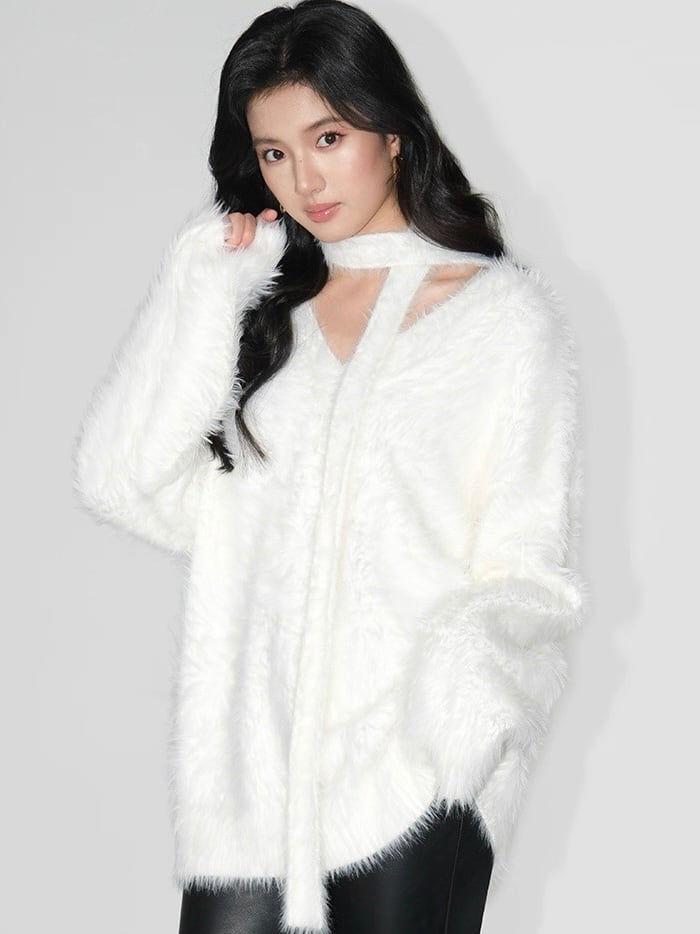 ふわふわの毛足が長いニット素材で、冬らしいリッチな雰囲気を味わえます。Vネック×チョーカーの組み合わせが女性らしい抜け感をつくり、首元をきれいに見せてくれます。ほどよくゆるいシルエットで体型カバー力が高く、お腹まわり・二の腕もふんわり包み込む安心感。軽さと暖かさを両立した素材で、重たく見えない冬の細見えニットとして大活躍します。
