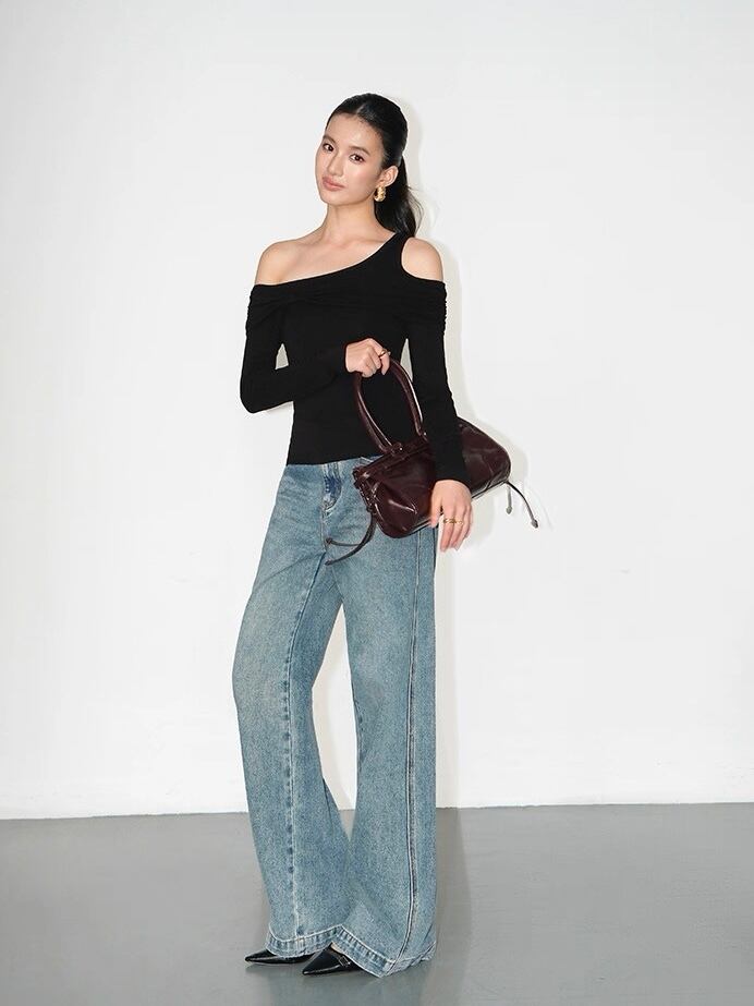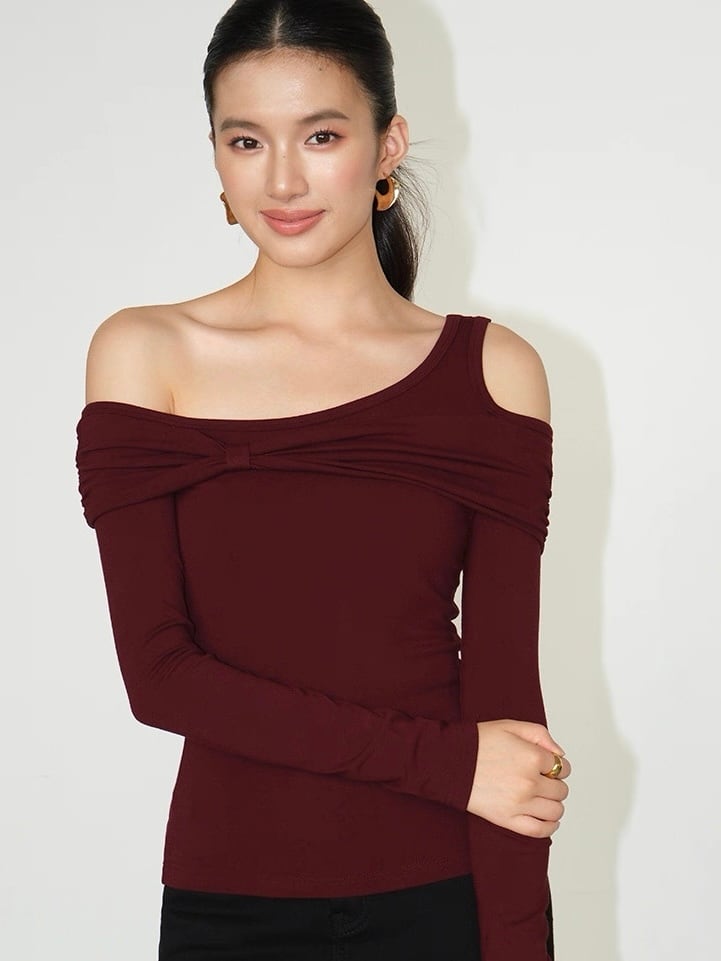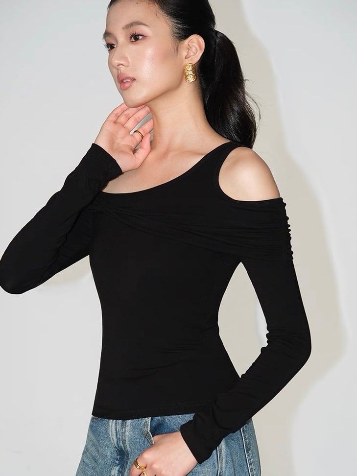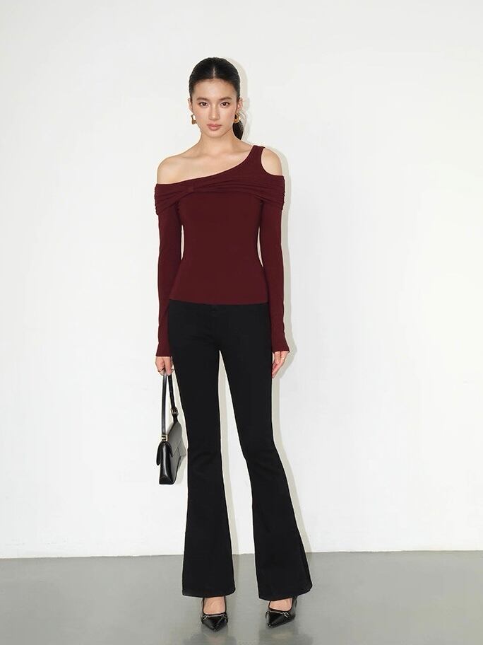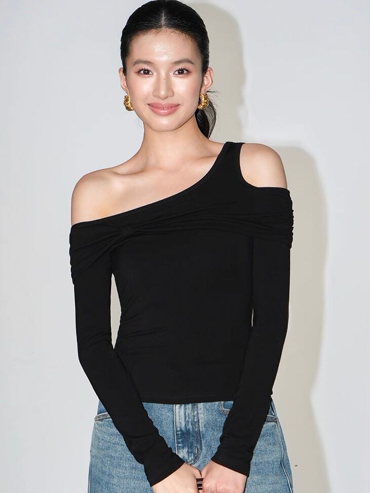 アシンメトリーなワンショルダーラインが女性らしさを引き立て、デコルテ・鎖骨の美しさを最大限に魅せてくれるスリムニットトップです。身体に優しく沿う伸縮素材でフィット感がありながらも、締め付けすぎず快適な着心地です。肩まわりのドレープが立体感をつくり、上半身を華奢に見せてくれるデザインです。色っぽいけど露出しすぎない絶妙なバランスで、いつものコーデにモードなアクセントを加えてくれる一枚です。