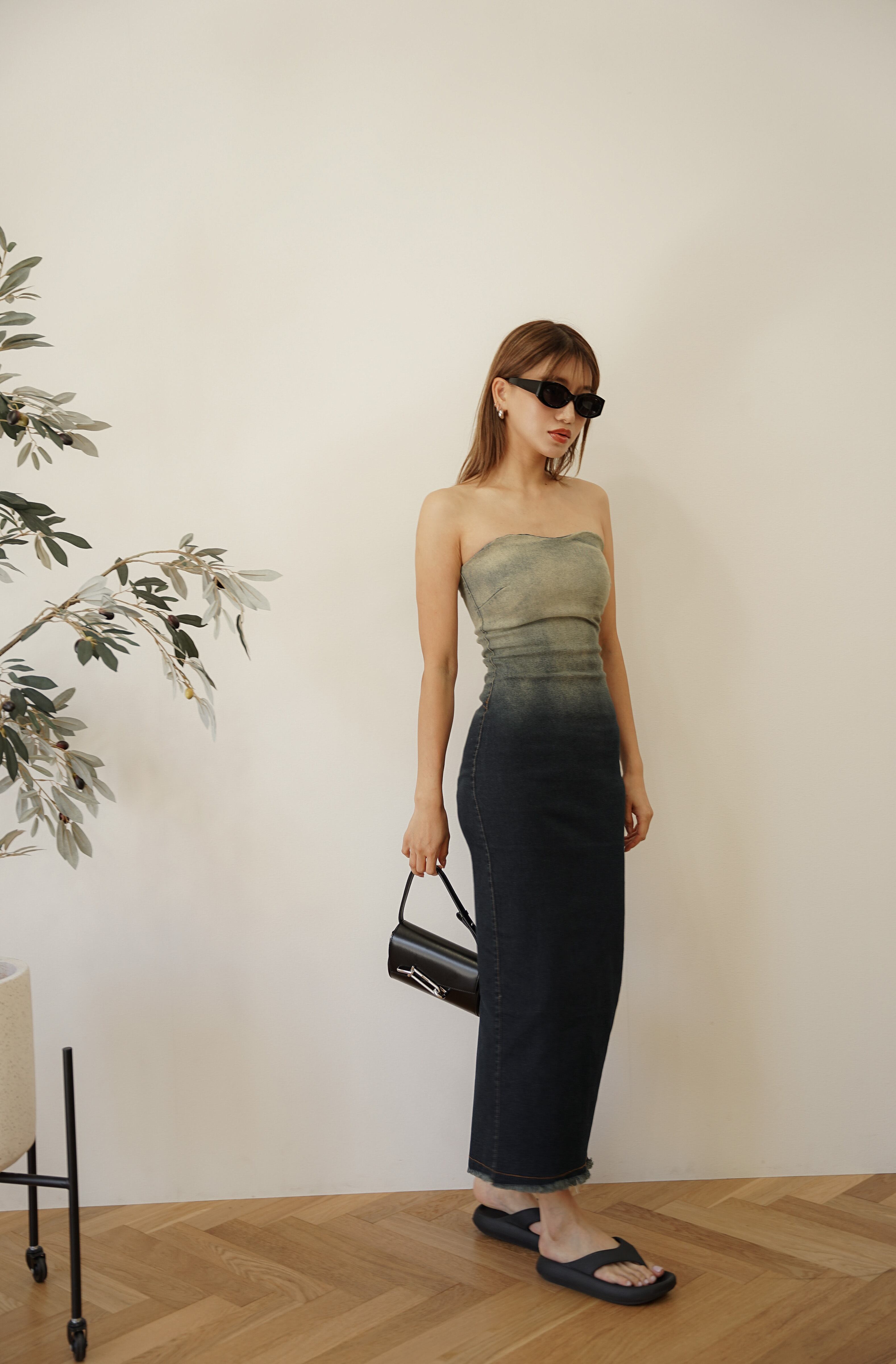 ・シックなグラデーションカラーのワンピース。デニム生地を使用したお洒落なシルエットを演出してくれます。