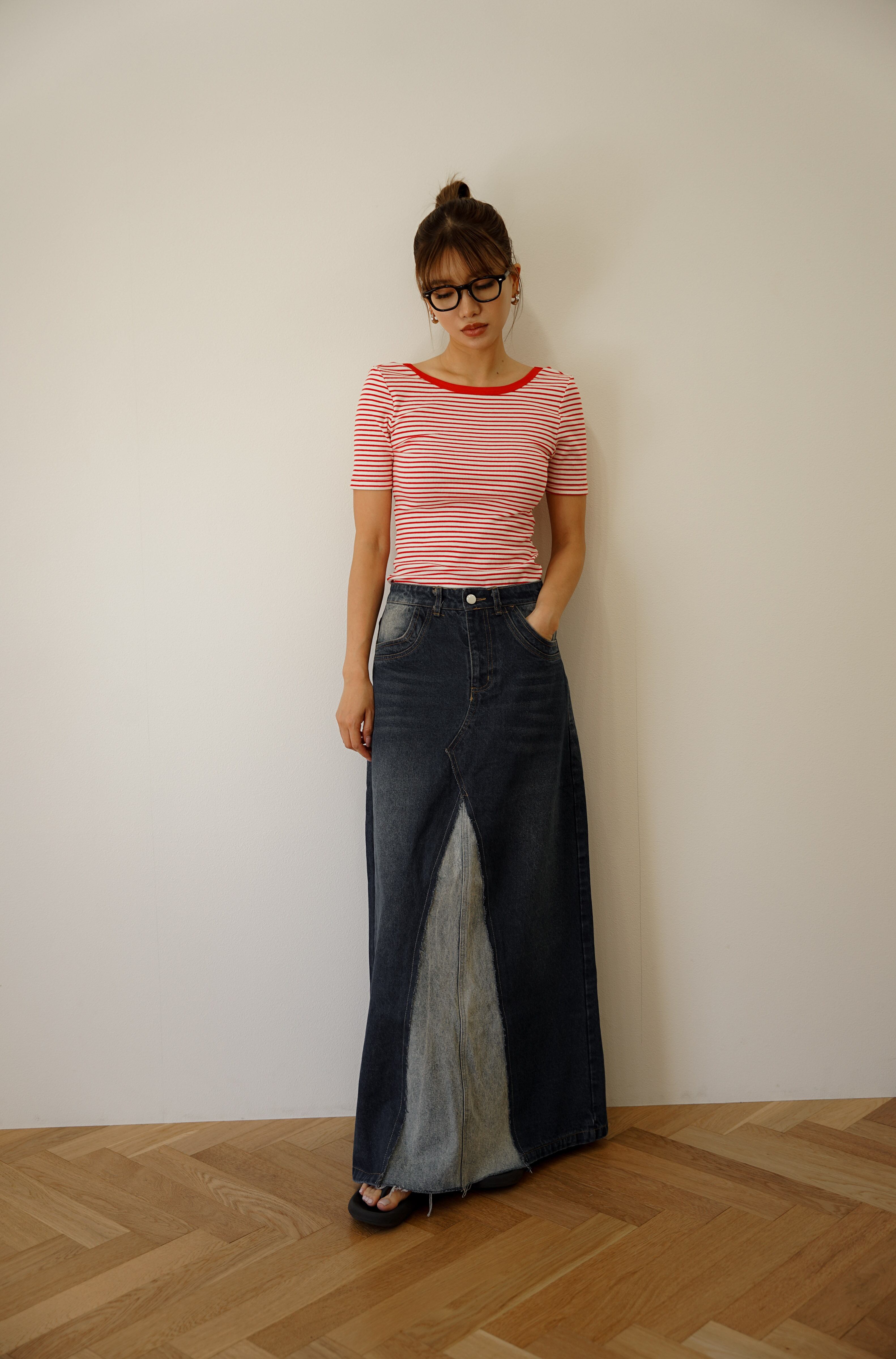 ・シンプルながらも個性的なデザインのバックオープンボーダーTシャツ。背中が大胆に開いているため、夏の暑さを感じずに涼しく過ごせる一枚です。