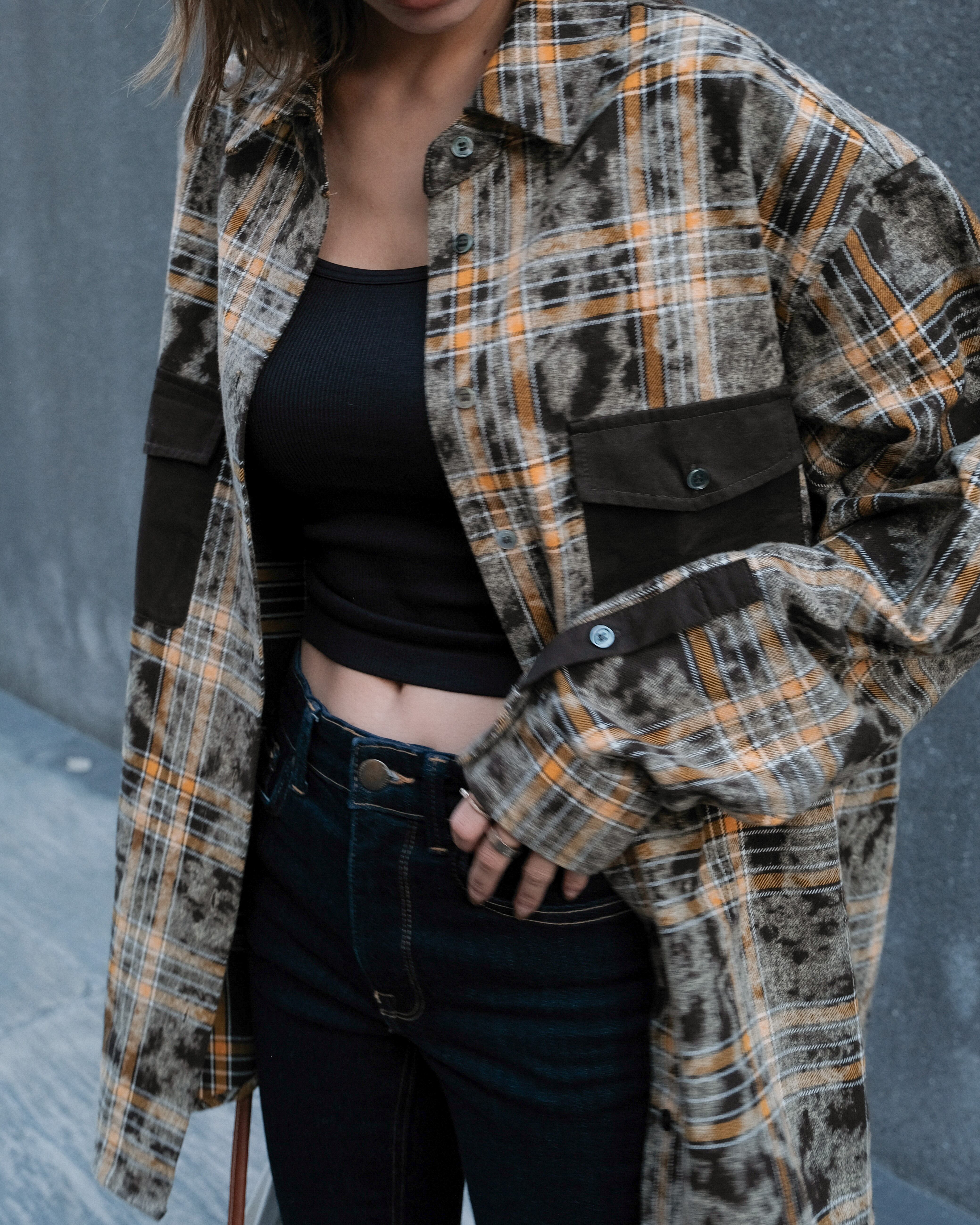 ダブルポケットチェック柄オーバーサイズシャツ