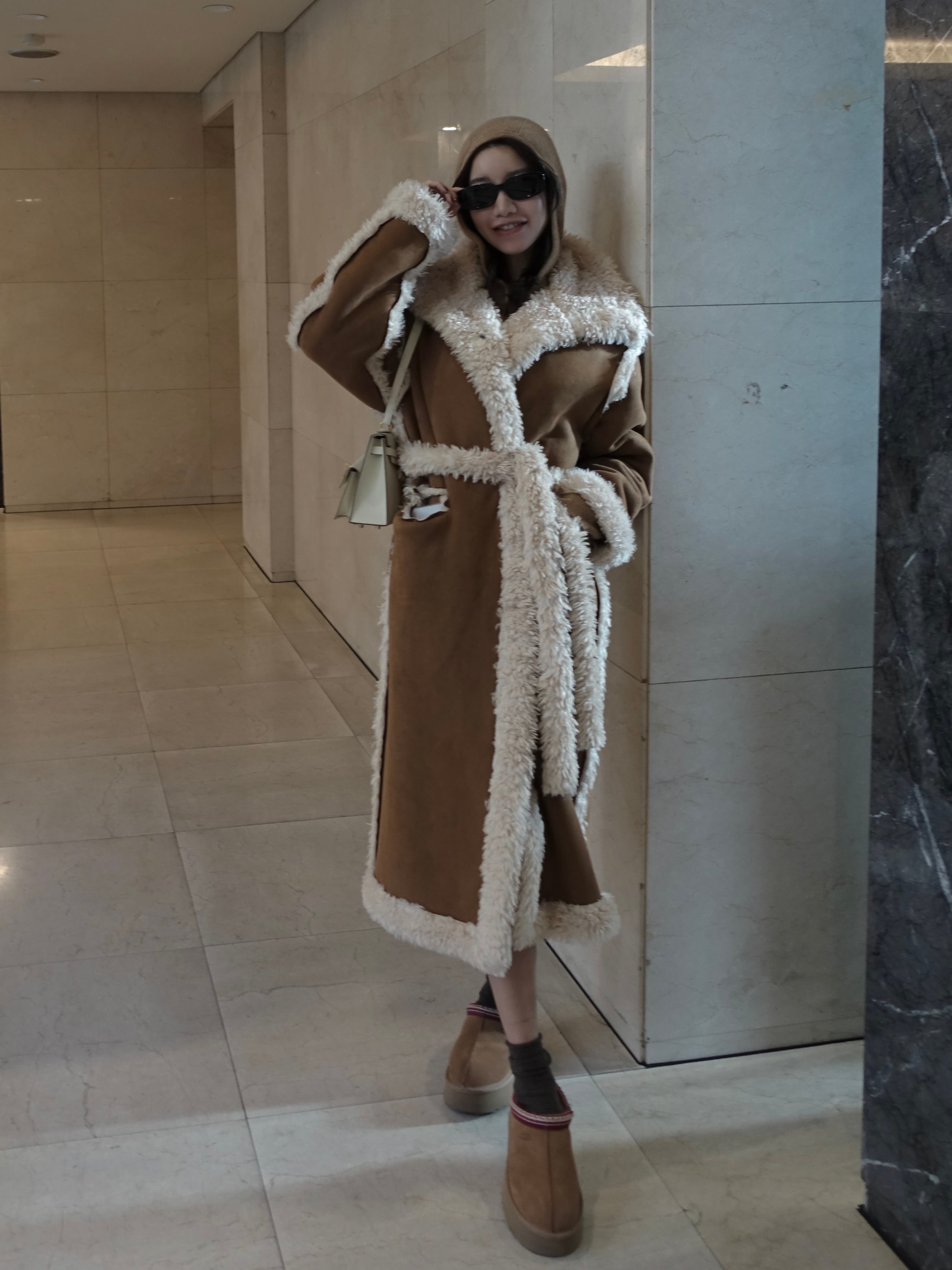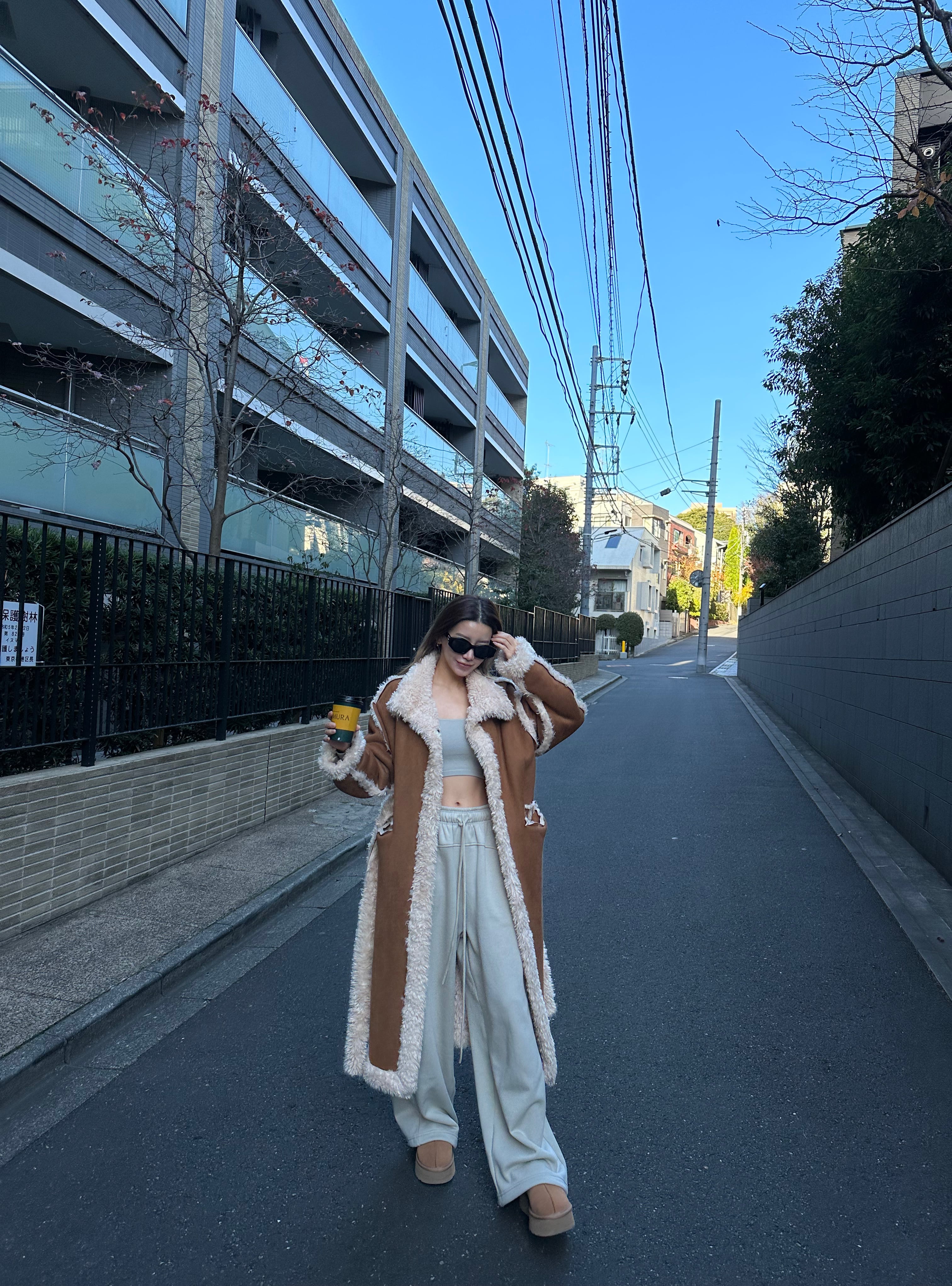 ・存在感のあるロングムートンコート。内側はすべてボア仕様でしっかり防寒できるアイテム。