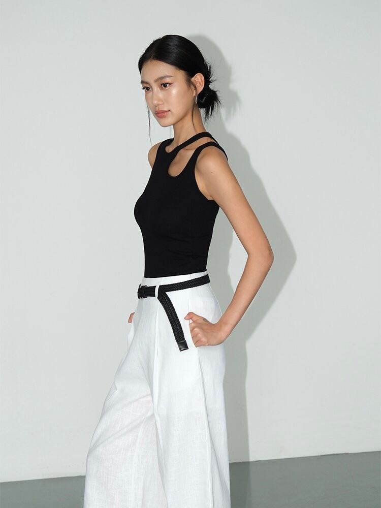 アシンメトリーのカットアウトデザインが特徴的で、シンプルながらも個性的なスタイルを演出するタンクトップ。どんなコーディネートにも合わせやすく、エレガントでクールな印象を与えます。カジュアルにもフォーマルにも対応できるため、デニムやスカート、ジャケットなど様々なアイテムと合わせやすいです。シンプルな中にもモダンなエッジが効いており、日常のスタイリングにアクセントを加えます。