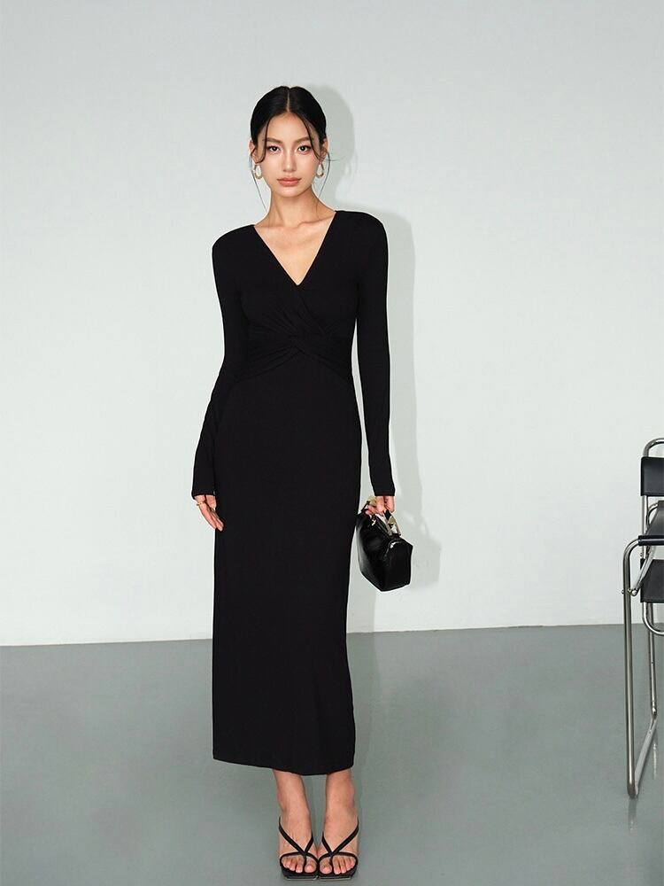 ウエスト部分に施されたツイストディテールが特徴的なドレス。ウエストラインを強調してスタイルを美しく見せます。シンプルながらも個性的なデザインが魅力です。体のラインに沿ったシルエットが、女性らしさを引き立てます。特にタイトなフィット感がスタイリッシュな印象を与えます。