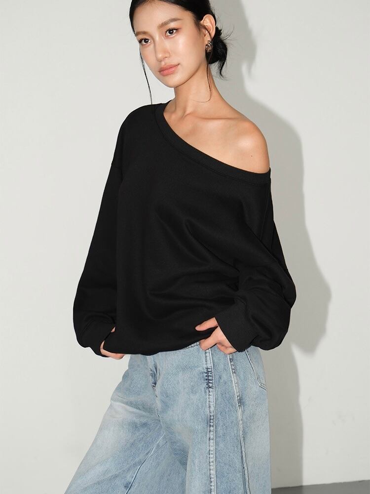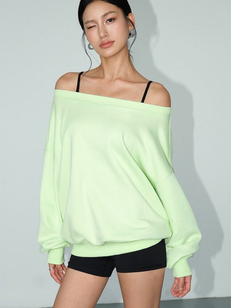 肩を少し露出させるオフショルダーデザインが特徴のトップス。リラックスしながらも女性らしさを引き立てます。カジュアルなスタイルに少しのエレガンスを加えたい時に最適です。ルーズなシルエットが全体にリラックス感を与え、快適な着心地を提供します。オーバーサイズのデザインが、今のトレンドにもマッチしています。