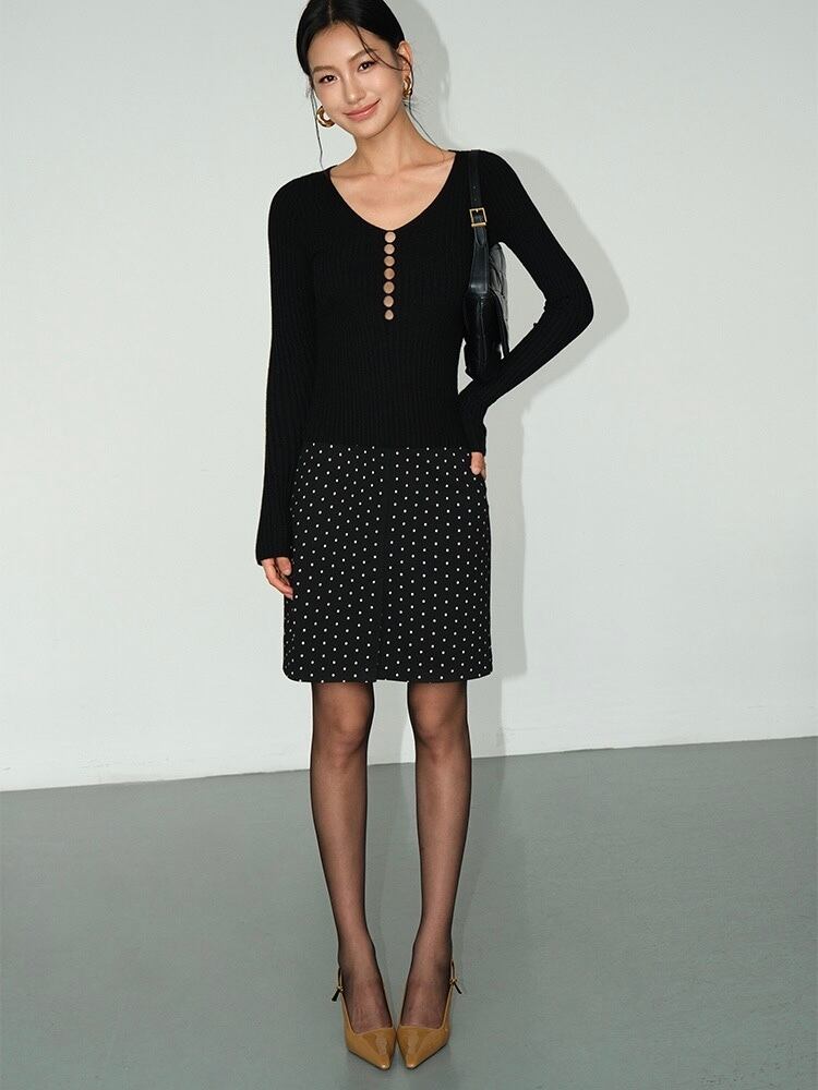 フロントに配置された穴あきのディテールが、シンプルなトップスに個性的なアクセントを加えています。視覚的なインパクトを与え、モダンでおしゃれな印象を与えます。適度な肌見せを可能にし、セクシーさと上品さを両立しています。控えめなセクシーさが大人の女性の魅力を引き立てます。
