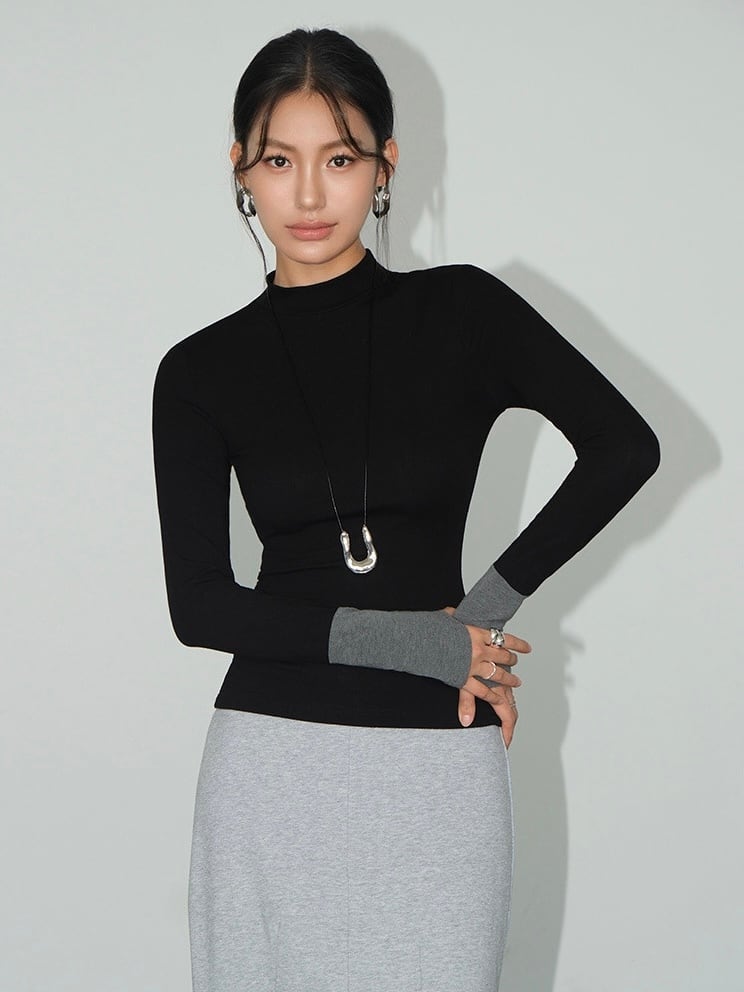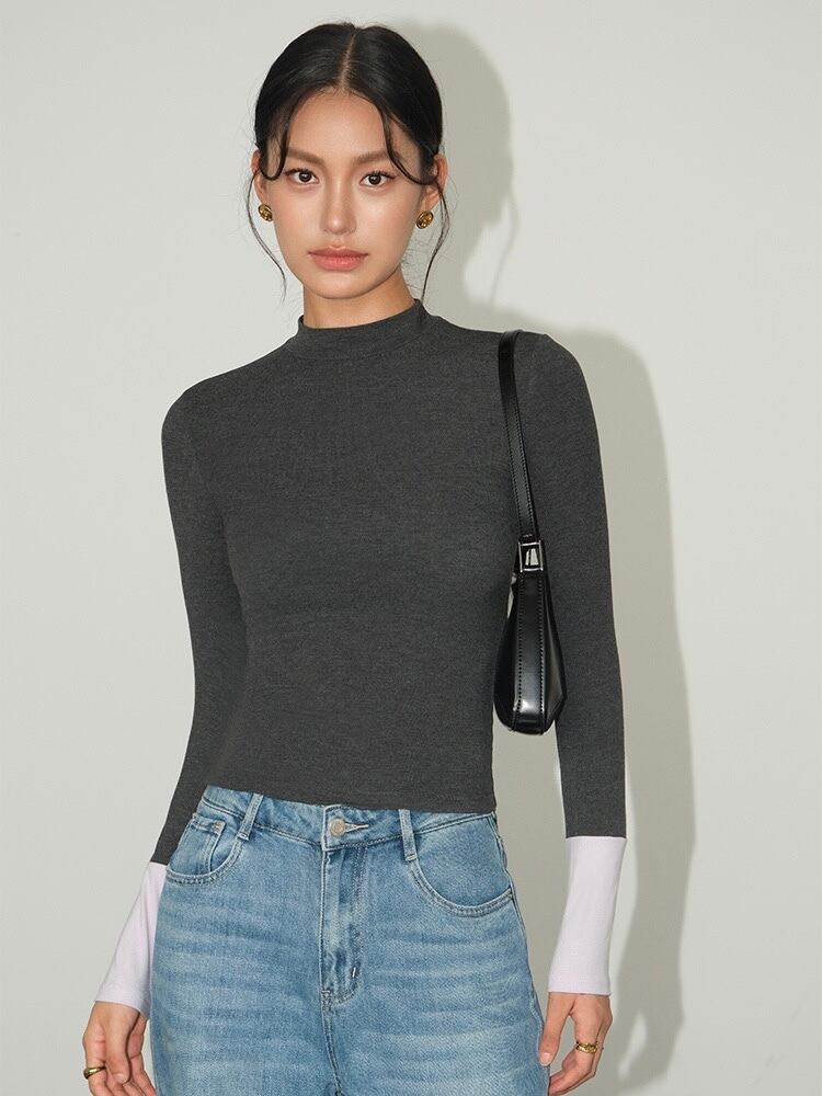 袖口に施されたコントラストカラーがアクセントになっており、シンプルなトップスに個性をプラスしています。このデザインは、シンプルながらもトレンド感を演出してくれます。体にフィットするタイトなシルエットが特徴で、スタイルを美しく見せる効果があります。シンプルさとデザイン性を兼ね備え、日常使いからフォーマルなシーンまで幅広く活躍するアイテムです。