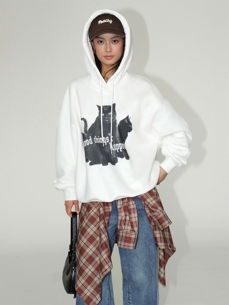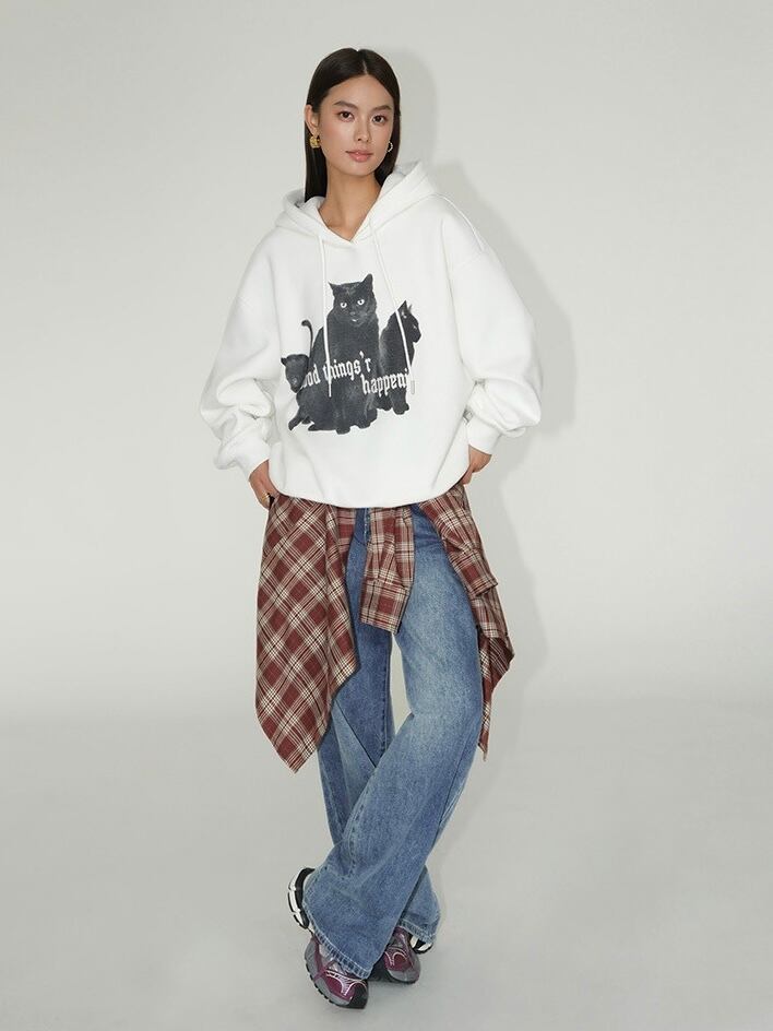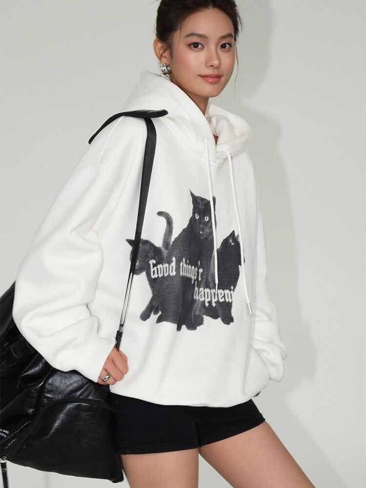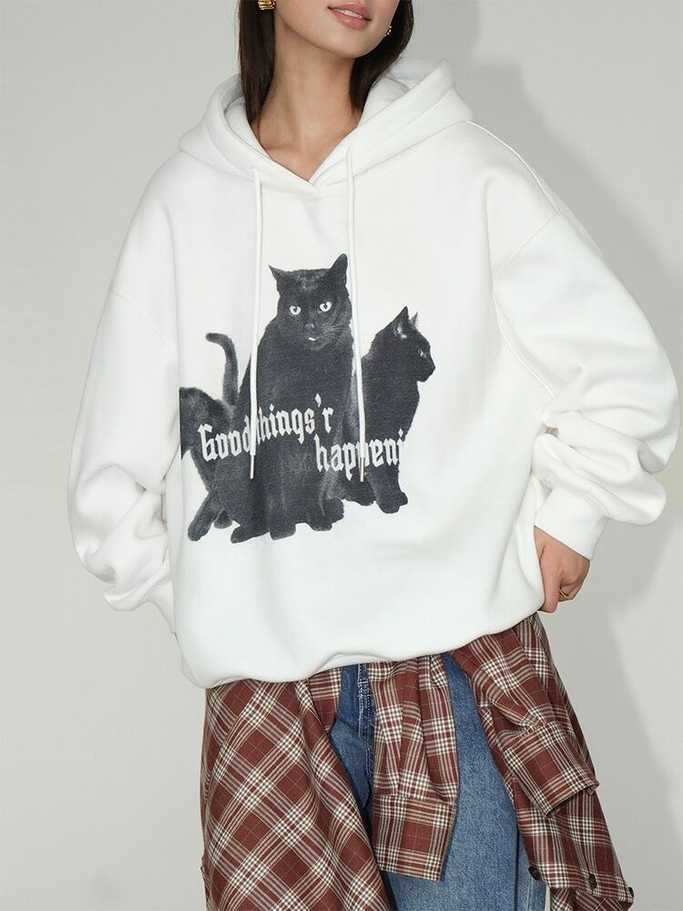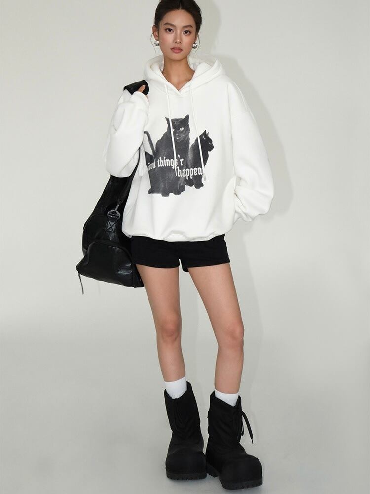 全面に描かれた黒猫のグラフィックとキャッチフレーズが印象的で、遊び心のあるデザインです。このデザインは、シンプルなパーカーにユニークな個性を加えています。オーバーサイズのシルエットが特徴で、リラックスした着心地が得られます。ゆったりとしたフィット感があり、カジュアルでリラックスしたスタイルに最適です。