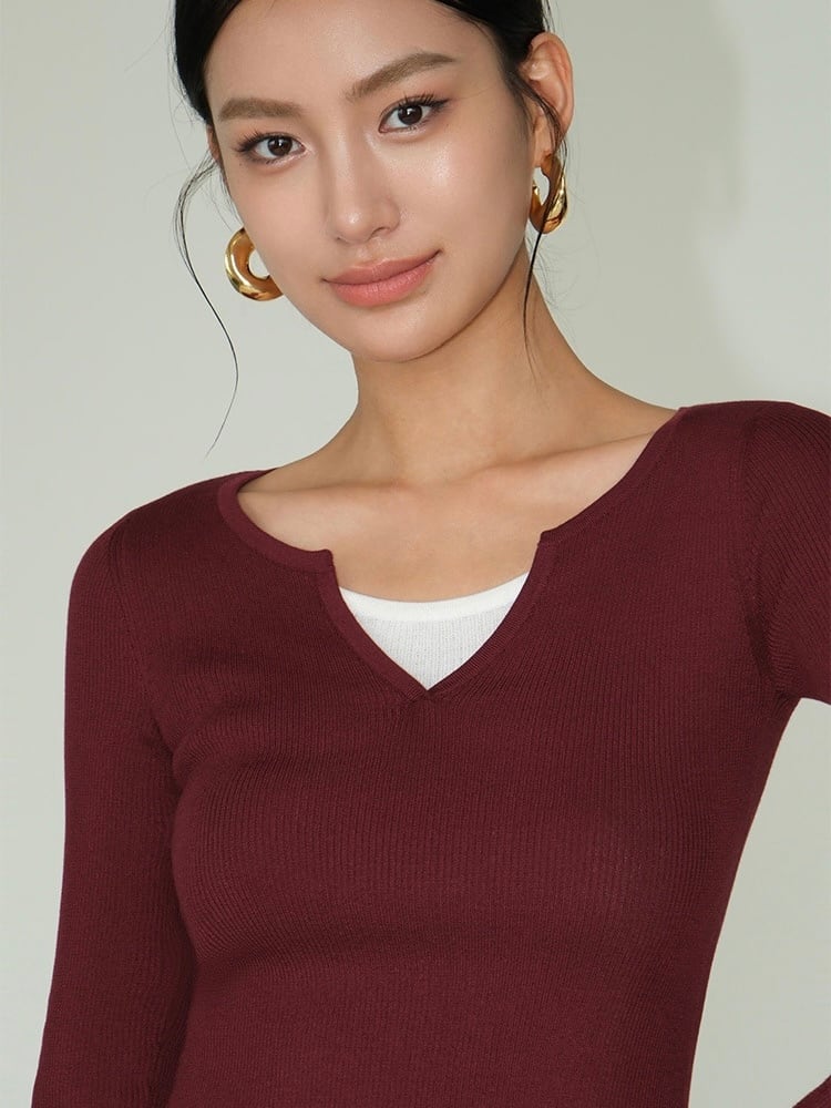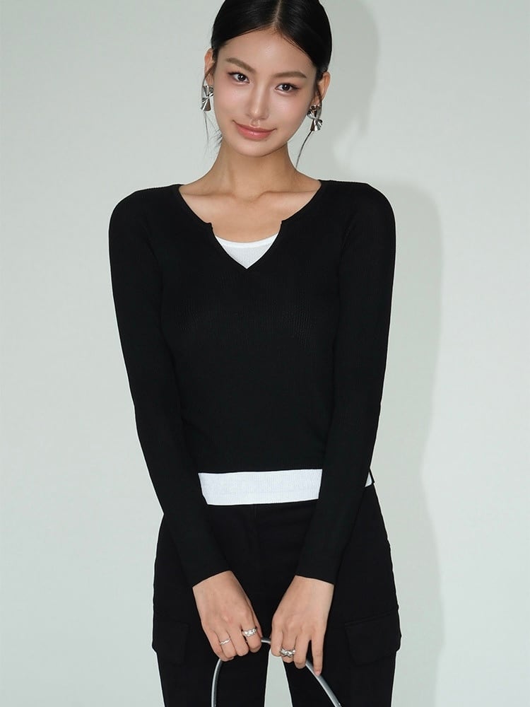 白のインナーがチラリと見えるデザインは、一枚で簡単にレイヤードスタイルを楽しめます。ボディにフィットし、すっきりしたラインを作り出すので、スタイルアップ効果があります。ベーシックなカラーリングなので、カジュアルからオフィスまで幅広いシーンで活躍します。リブ編み素材を使用しているため、軽くて動きやすく、1年を通して使いやすいアイテムです。