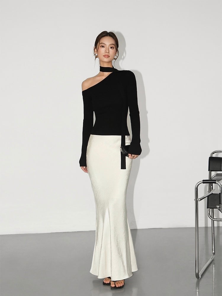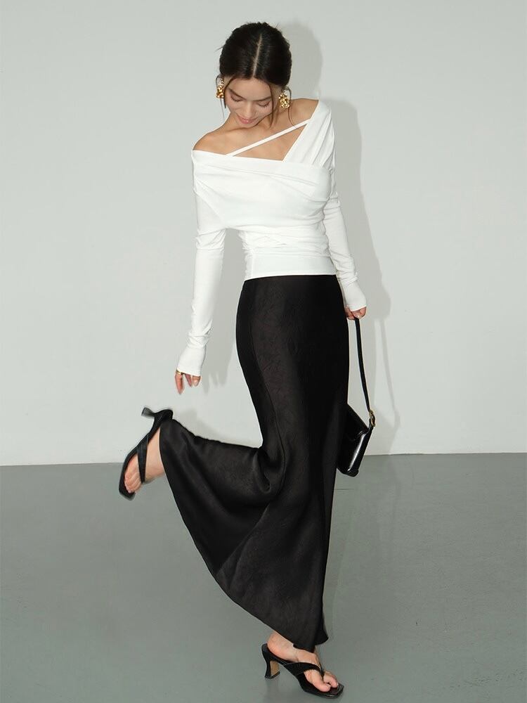 ボディラインに沿って美しいカーブを描き、女性らしさを強調するマーメイドシルエットが特徴です。光沢のあるサテンやシルク風の素材感がエレガントで、パーティーシーンにもぴったりです。フロアレングスのデザインは、脚を長く見せ、上品な雰囲気をプラスします。ディテールがシンプルでも、スタイリングによって華やかな印象を演出できます。トップス次第でカジュアルにもドレッシーにもアレンジ可能です。美しいラインを保ちながらも、柔らかい素材で動きやすく、長時間の着用でも快適です。
