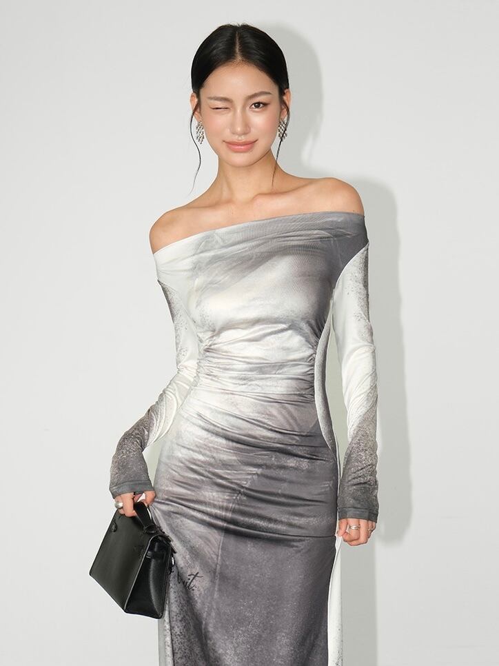 上品で洗練されたグラデーション効果のプリントが、ユニークな魅力を引き立てます。肩を美しく見せるオフショルダーのデザインは、フェミニンかつセクシーな印象を与えます。体にフィットするシルエットが、スタイルを強調し、エレガントな雰囲気を演出します。マキシ丈のデザインは脚長効果があり、上品な印象を引き立てます。ぼかしの効いたカラーは、トレンド感があり、シンプルながらも存在感を持たせています。