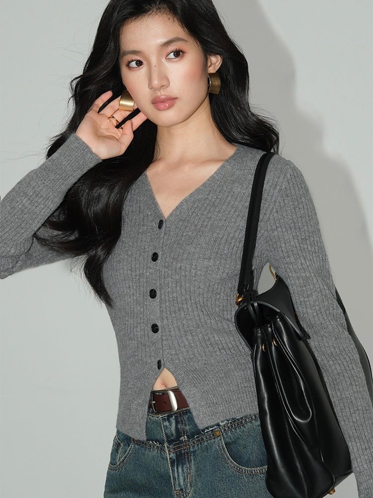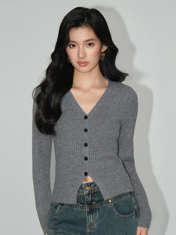 体のラインに沿うデザインが、フィット感を高めて美しいシルエットを演出。フェミニンかつすっきりとした印象を与えるデザインです。ボタンを閉じてトップスとしても、開けて羽織としても使える2way仕様。ソフトな肌触りと暖かさを兼ね備えた生地感が特徴です。デニムやスラックス、スカートと合わせてさまざまなスタイルに対応可能です。セミクロップドデザインがハイウエストのボトムスとも好相性です。