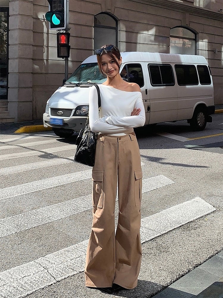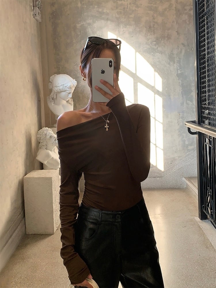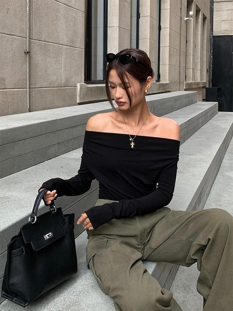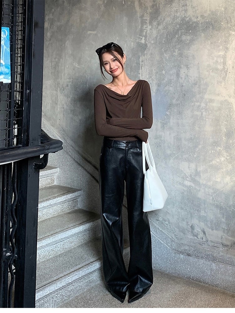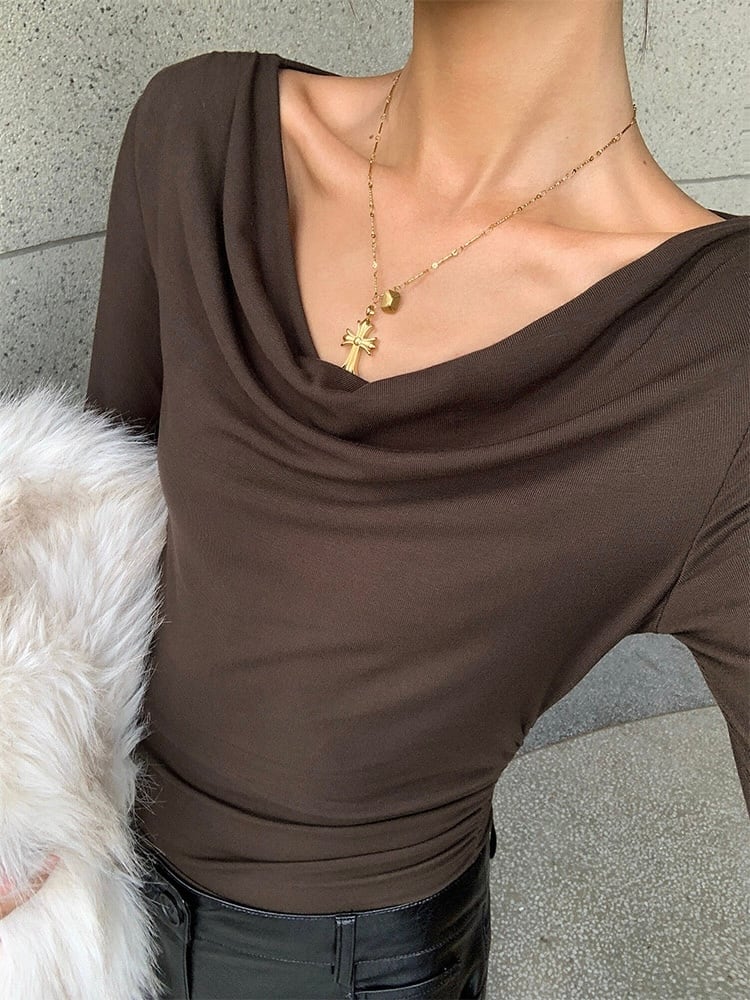 ネックラインにゆるやかなドレープを取り入れ、顔まわりを美しく見せるシルエットが特徴です。デニムやスラックス、スカートなど、カジュアルからフォーマルまで幅広いスタイルに合わせやすいです。スリムフィットのデザインが体型を美しく引き立てつつ、柔らかな素材で動きやすいです。装飾を抑えたシンプルなスタイルが、現代的で洗練された印象を与えます。