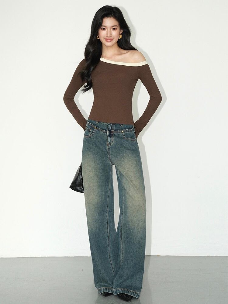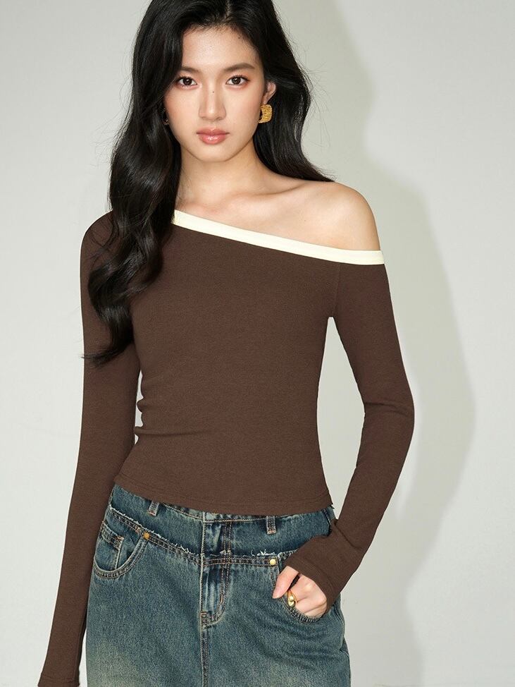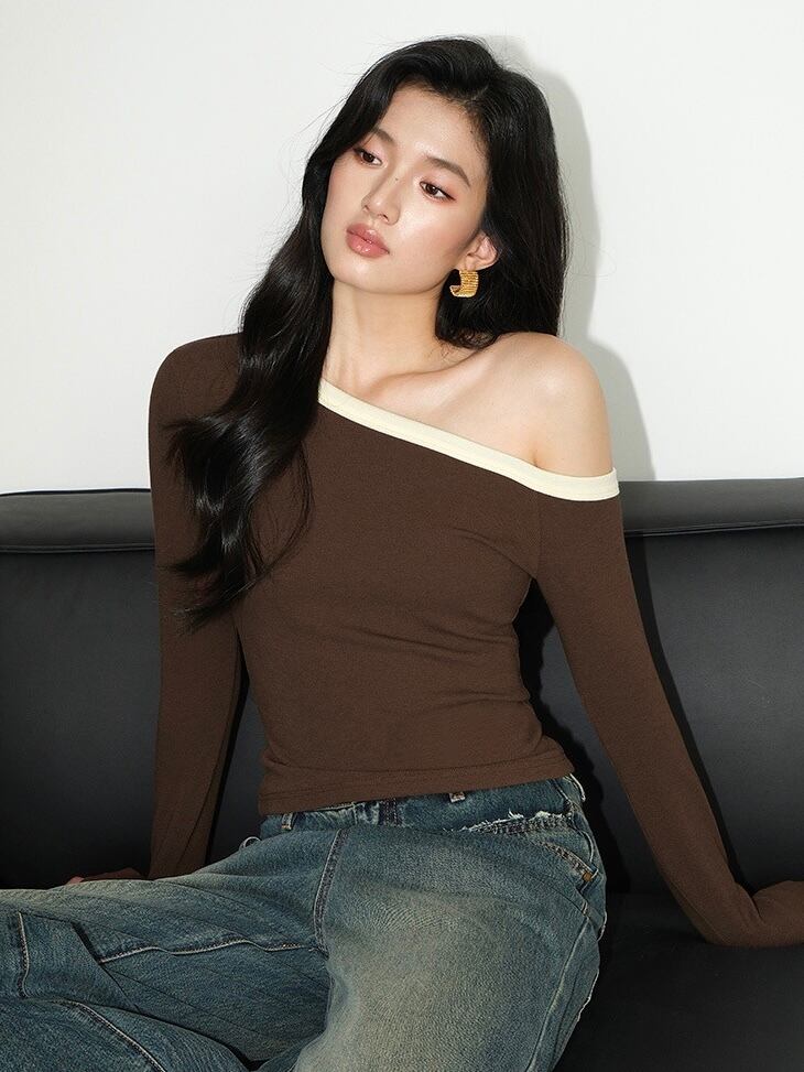 襟元の異なるカラーラインがシンプルながらも華やかさをプラスします。肩を少し見せるデザインが女性らしくセクシーさと上品さを両立します。スタイルを美しく引き立てるシルエットで、デニムやスカートとの相性も抜群です。春や秋の軽めアウターとのレイヤードスタイルや、冬はインナーとしても活躍します。
