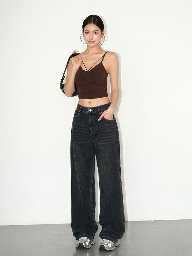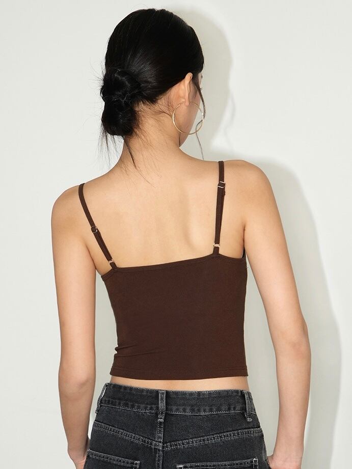 ダブルストラップデザインがポイントになって、女性らしい雰囲気を演出します。デニム、スカート、ジャケットのインナーとしても使えて、カジュアルにもキレイめにも合わせやすいです。シックなカラー展開なので色んなコーデに合わせやすいです。ハイウエストボトムスと合わせると脚長効果が期待できます。