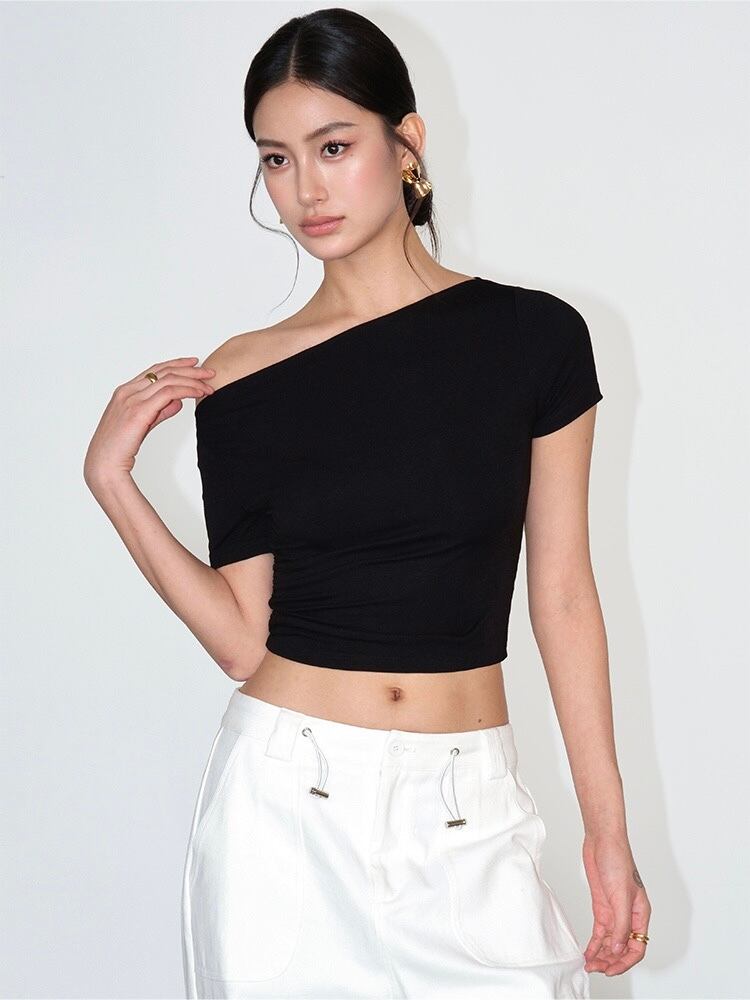 片側がオフショルダーになっており、程よく肌見せできるバランスが絶妙です。身体にフィットするデザインで、女性らしい曲線美を引き立てます。ハイウエストボトムと相性抜群で、脚長効果も期待できます。カジュアルにもモード系にも合わせやすく、幅広いコーデに対応可能です。ホワイト、ブラック、カーキなど、どんなスタイルにもマッチする落ち着いた色展開です。柔らかく伸縮性のある素材で、動きやすくストレスフリーです。シンプルながらもデザイン性が高いので、大ぶりのピアスやネックレスと相性抜群です。